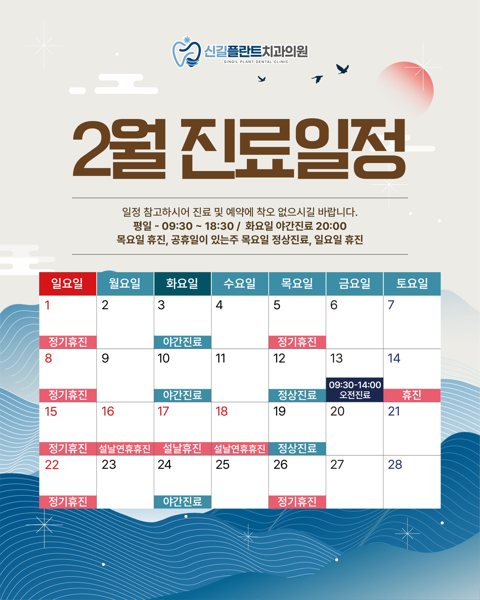 * 목요일 해당주에 공휴일이 있는 주에는 목요일 정상진료